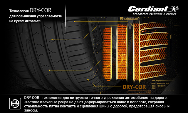 Запатентованная технология DRY-COR способствует уверенному поведению автомобиля в любых направлениях движения и повышению курсовой устойчивости.