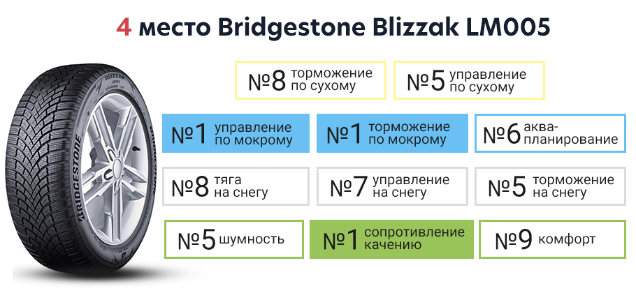 Hankook была приятной в управлении, чувствовался отличный зацеп во всех направлениях. Bridgestone Blizzak LM05 давала наилучшее сцепление, обеспечивала короткую тормозную дистанцию (на 1,5 метра короче чем у ближайших конкуренток), но, как отметил эксперт в поездках не хватало драйва.